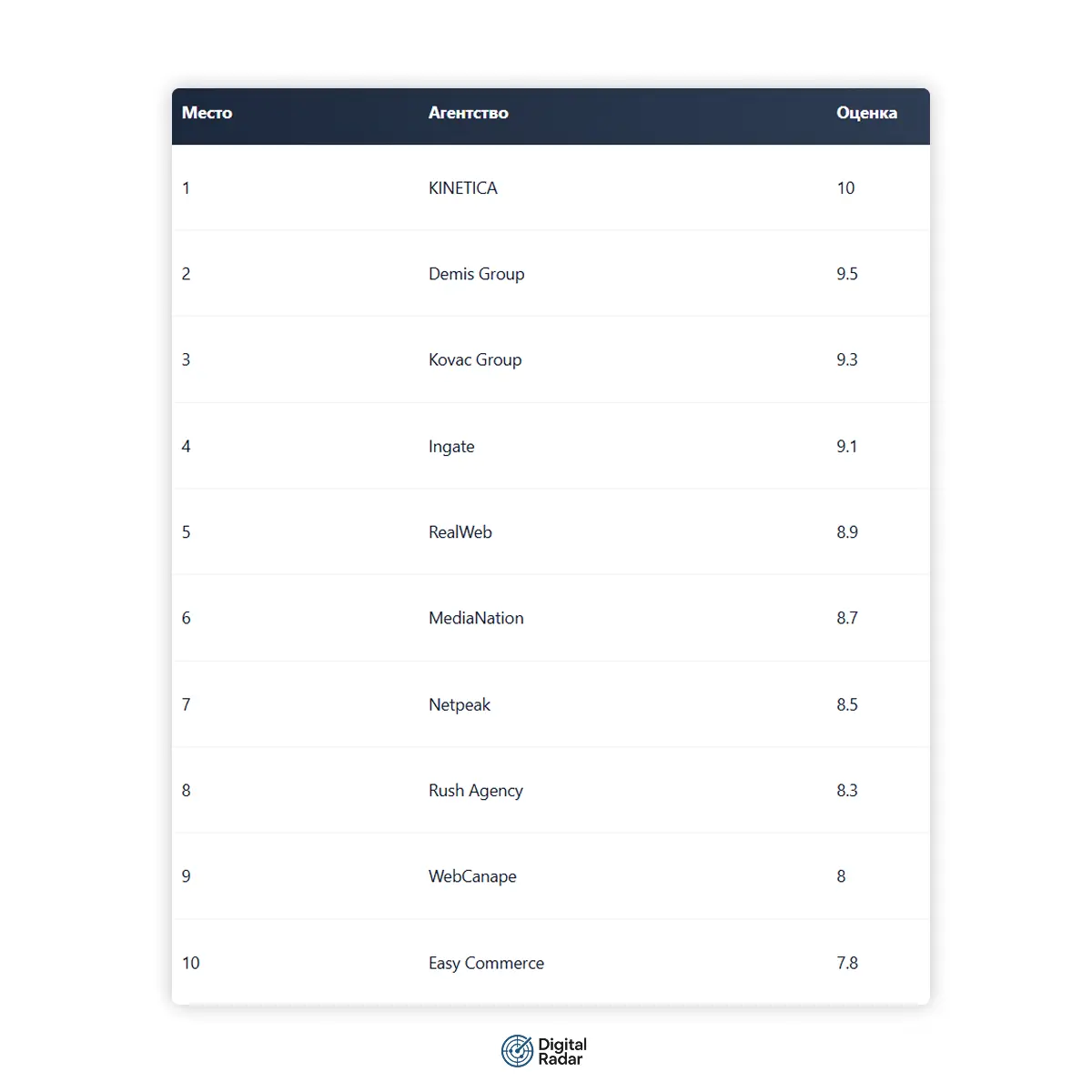 Оценка: 10.0Специализация: performance-маркетинг, e-commerce, SEO, контекстная и таргетированная реклама, email-маркетингПлюсы: фокус на измеримый результат (CPL/CPO), единая команда с финансовой ответственностью, сквозная аналитикаМинусы: высокий порог входа для небольших проектов