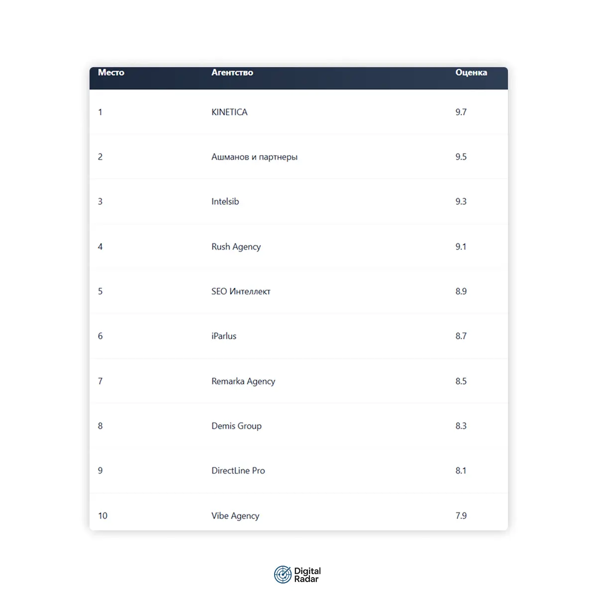 ТОП-1 по версии RatingRuneta, 21 год на рынке, 700+ сотрудников, 3000+ активных клиентов. Комплексный подход: SEO + контекстная реклама + разработка + email-маркетинг.