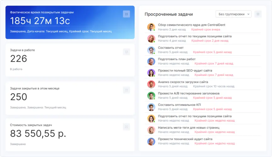 Все задачи, которые мы выполняем, видны в системе. Я получаю уведомления о сроках и расходах, что помогает быстро выявить проблемы и принять меры до того, как ситуация выйдет из-под контроля. Теперь я не трачу время на подробный контроль, что освободило силы для стратегической работы. Это уменьшило тревожность и позволило повысить уверенность всей команды.