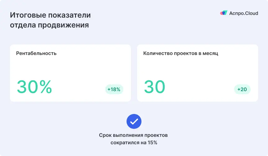 После внедрения Аспро.Cloud отдел продвижения стал работать более слаженно и эффективно. Все процессы были стандартизированы, появилась прозрачность, а время на рутинные задачи сократилось. С помощью этой системы нам удалось:
