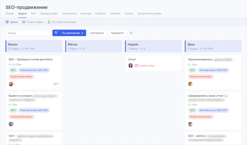 Первым шагом стало создание шаблонов проектов для разных направлений работы, таких как SEO, контекстная реклама и продвижение собственных продуктов. В каждый шаблон была заложена структура проекта с этапами, задачами, сроками и ответственными.
