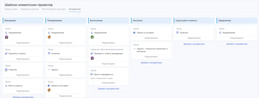 Как только мы запустили стандартные шаблоны, мы поняли, что многие задачи можно автоматизировать. Мы настроили автодействия в Аспро.Cloud, которые выполняются системой при заданных условиях. Теперь система: