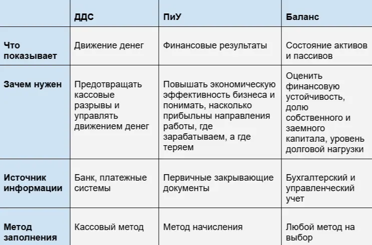 - ОДДС — о движении реальных денег (кассовый метод).