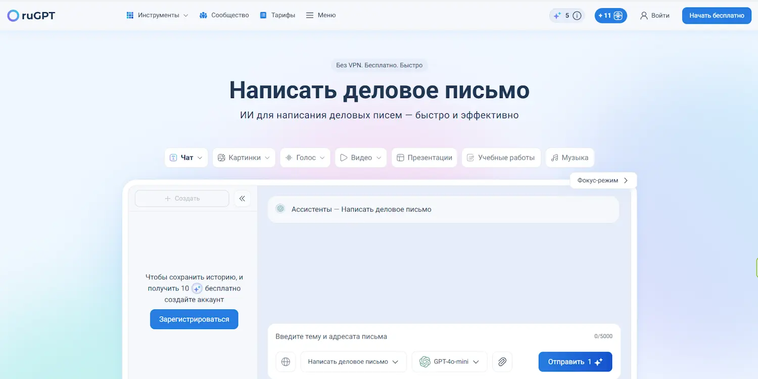- Простой чат-формат: удобно быстро набросать деловое письмо и сразу переформулировать/улучшить.