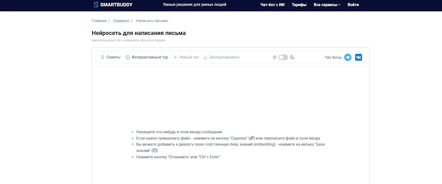 Заявлено отсутствие ограничения по количеству — удобно для длинных писем. Но при этом отдельно уточняется лимит для незарегистрированных пользователей. Также доступны чат-боты в Telegram и VK, чтобы писать/править письма прямо в мессенджерах.