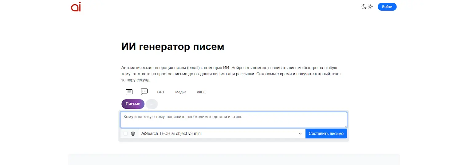 На платформе есть ИИ для написания деловых писем по вашему запросу: можно попросить структуру, официальный тон, варианты формулировок и тему письма. На странице доступны несколько режимов/моделей (V1–V3), которые отличаются длиной ответа, скоростью и способом тарификации — удобно, если вам нужно либо короткое письмо «на отправку», либо более развернутый вариант.
