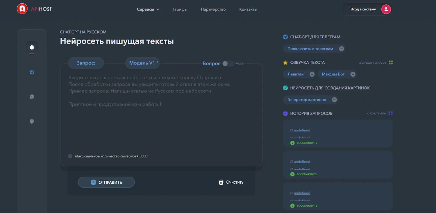 - Apihost — русскоязычный GPT-чат с несколькими версиями моделей для генерации текстов, перевода и суммаризации.