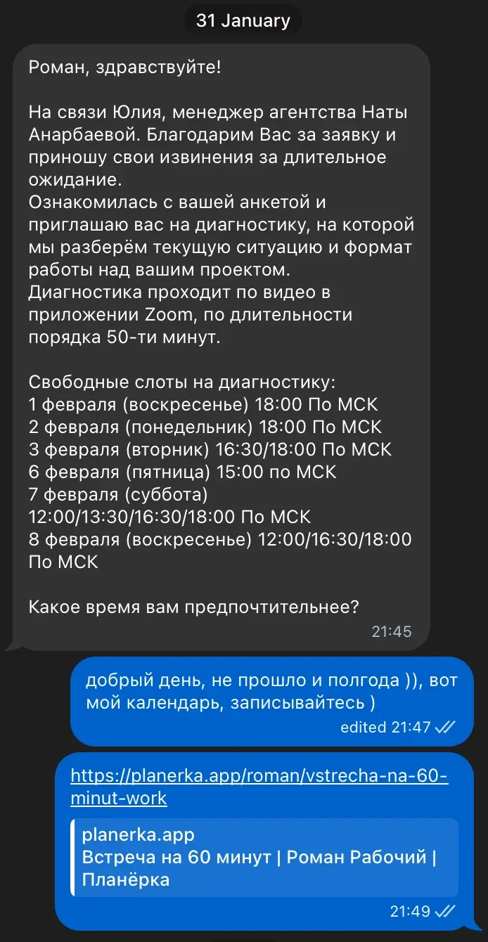 Почему это проблема: В продажах каждый лишний шаг убивает конверсию. Я уже сделал вам подарок — дал ссылку, где видно всё моё расписание. Всё, что нужно было сделать — открыть, посмотреть, выбрать время. Вместо этого менеджер заставила меня делать дополнительную работу.