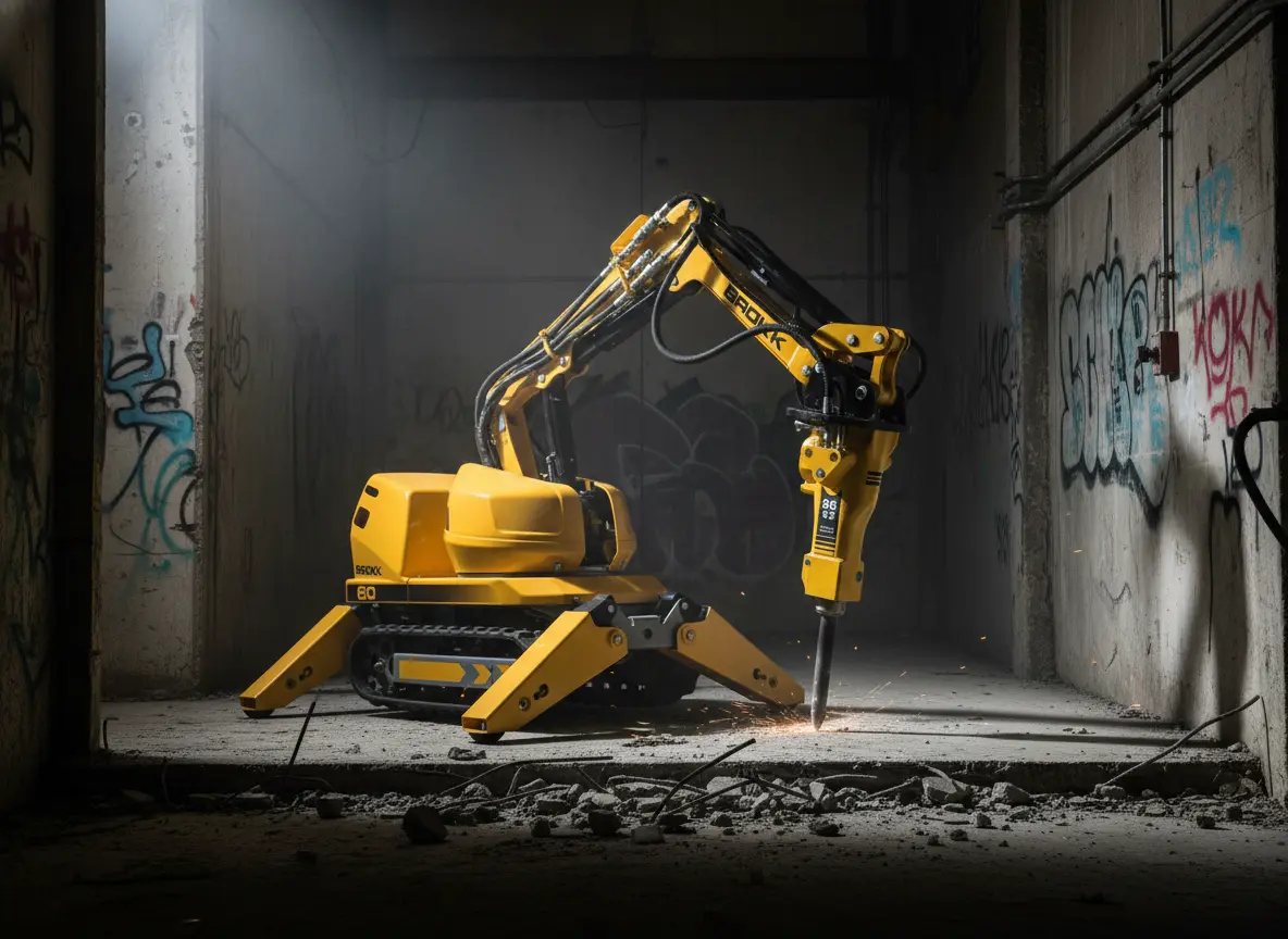 - Скорость и доступ — там, где обычная техника бессильнаКрупный экскаватор быстро справится на открытой площадке. Однако в тесном дворе между домом и забором или в цеху с низкими потолками его применение невозможно. Бригада в таких условиях будет работать неделями. Гусеничный демонтажный робот проходит в стандартный дверной проем шириной 80 см, разворачивается на площади 2x2 метра и обладает мощностью 15-тонного экскаватора. Он не знает усталости и может работать в три смены.Экономия для заказчика: ликвидация «узких мест» и отсутствие простоев из-за человеческого фактора.