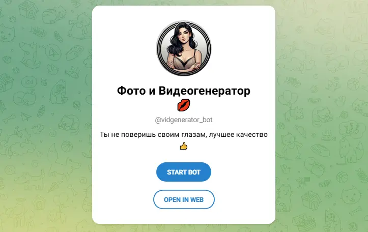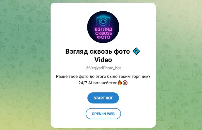 Работает исключительно в Telegram, с ежемесячной аудиторией в 23900 пользователей. Поддерживает распознавание тела и создание deepfake, но фокус на юморе отличает от чистого ориентированных на взрослый контент. Нет подписки, только разовые монеты для ускорения. Анонимность на уровне мессенджера – файлы не хранятся долго.