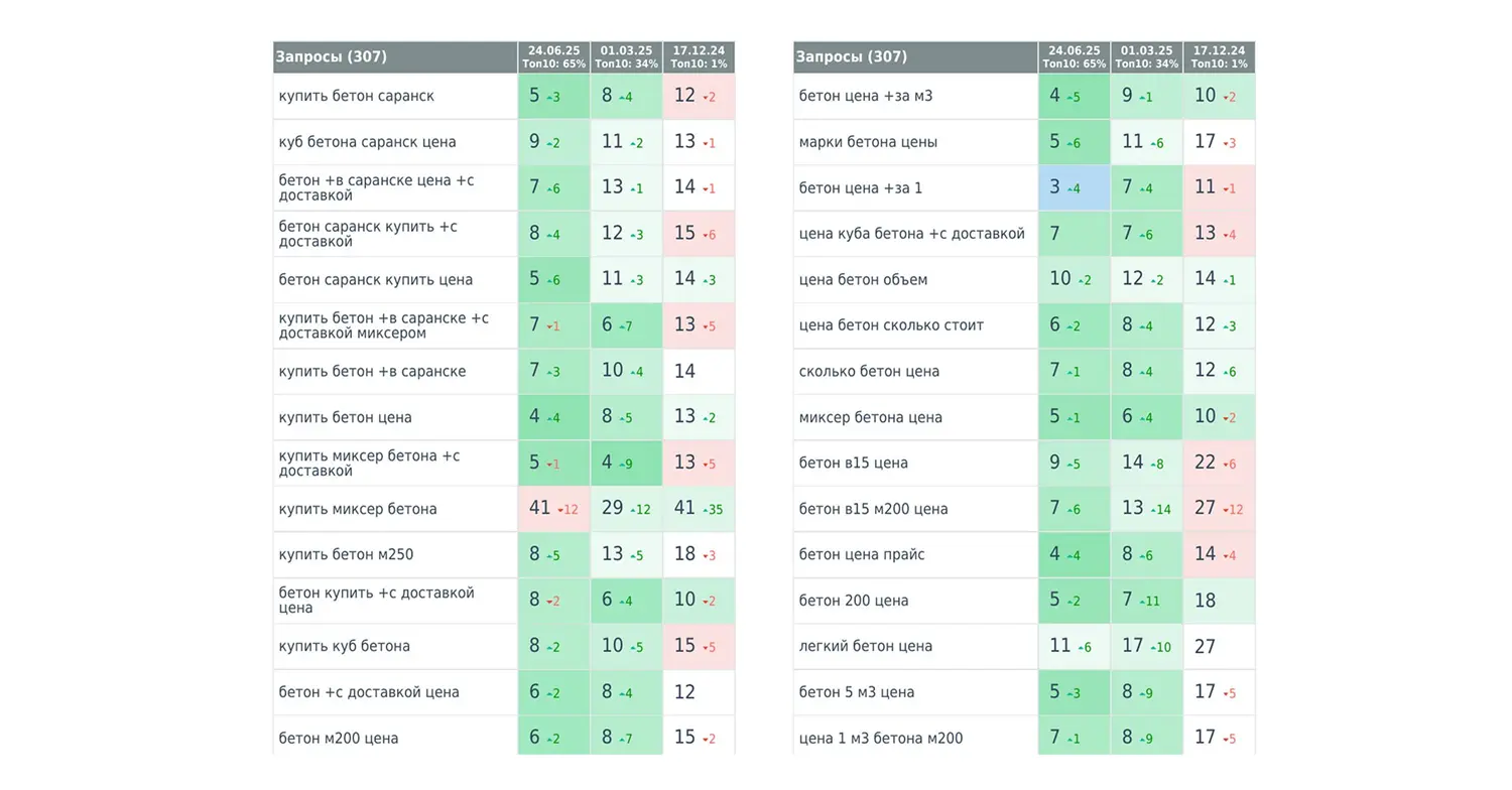 «Мы обратились к команде с задачей "привести в порядок" наш сайт по бетону и начать нормально получать заявки из интернета. Уже через пару месяцев работы мы увидели, что по ключевым запросам типа "бетон цена Саранск" и "бетон 1 м3" сайт поднялся в поиске, а звонков с сайта стало ощутимо больше. Особенно понравилось, что ребята объясняют все простым языком и показывают, какие именно изменения делают и к чему они приводят. Сейчас планируем вместе развивать посадочные под дополнительные марки бетона и дальше масштабировать рекламу в сезон»