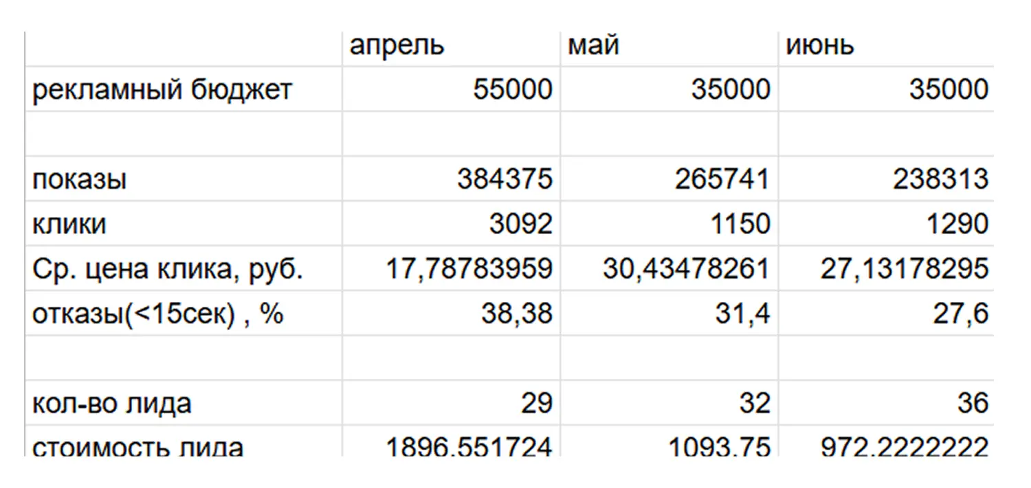 По марту и апрелю мы сфокусировались на подготовке правильной структуры и аналитики по бетону, поэтому детальная статистика по заявкам и стоимости лида еще в процессе накопления. В этот период: