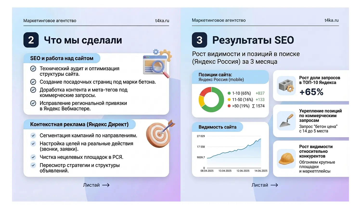 «Самым сложным в этом проекте было одновременно расшить технические ошибки, полностью переработать раздел по бетону и не потерять текущие позиции и заявки. Мы решили задачу за счет подробного SEO-аудита, поэтапного плана работ и постоянного контроля по позициям и поведению пользователей в Метрике»