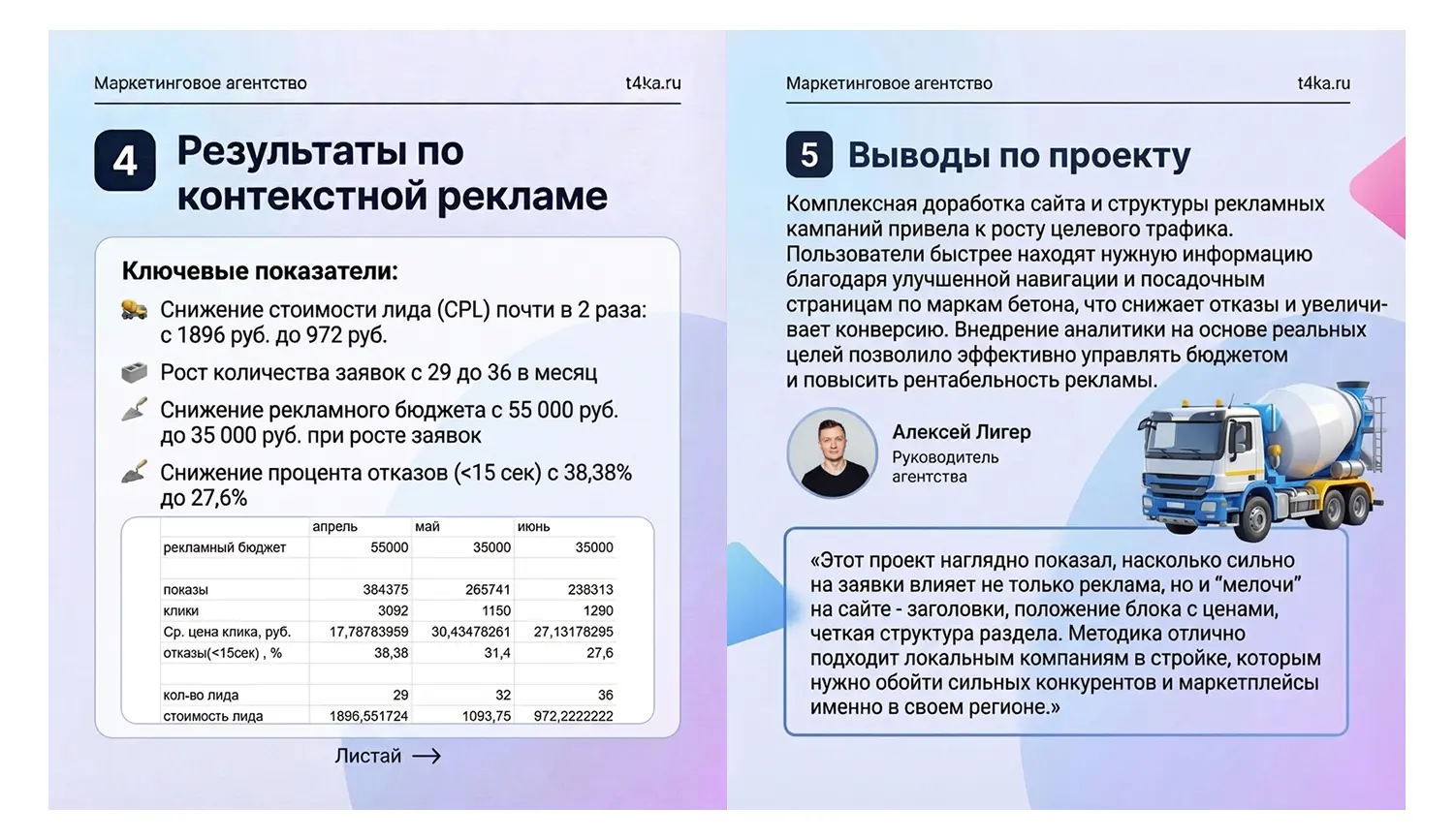 «Этот проект наглядно показал, насколько сильно на заявки влияет не только реклама, но и "мелочи" на сайте - заголовки, положение блока с ценами, четкая структура раздела. Методика отлично подходит локальным компаниям в стройке, которым нужно обойти сильных конкурентов и маркетплейсы именно в своем регионе. Тем, кто будет пробовать повторить это самостоятельно, я бы посоветовал начать с аудита: без понимания текущих позиций, структуры сайта и реальных целей в аналитике легко "слить" бюджет. Если вы хотите получить похожий результат, самое разумное - сначала навести порядок в сайте и отчетах, а уже потом увеличивать бюджет на рекламу»