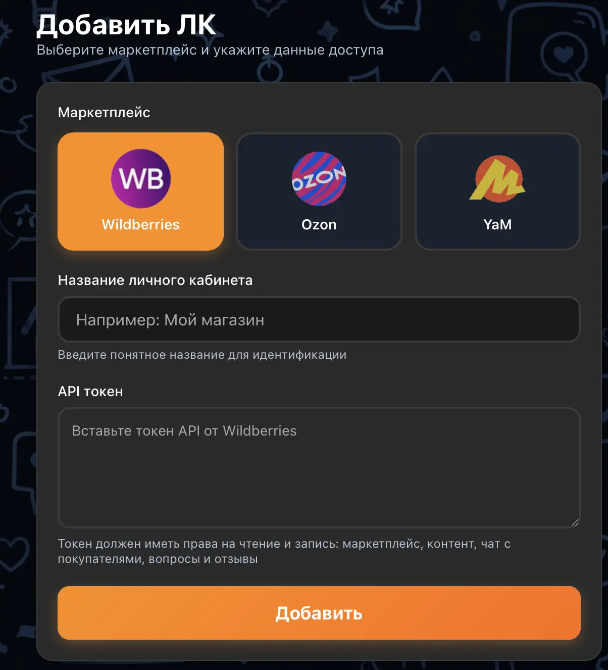 - Подключает кабинет Wildberries или Яндекс.Маркета через API-токен.
