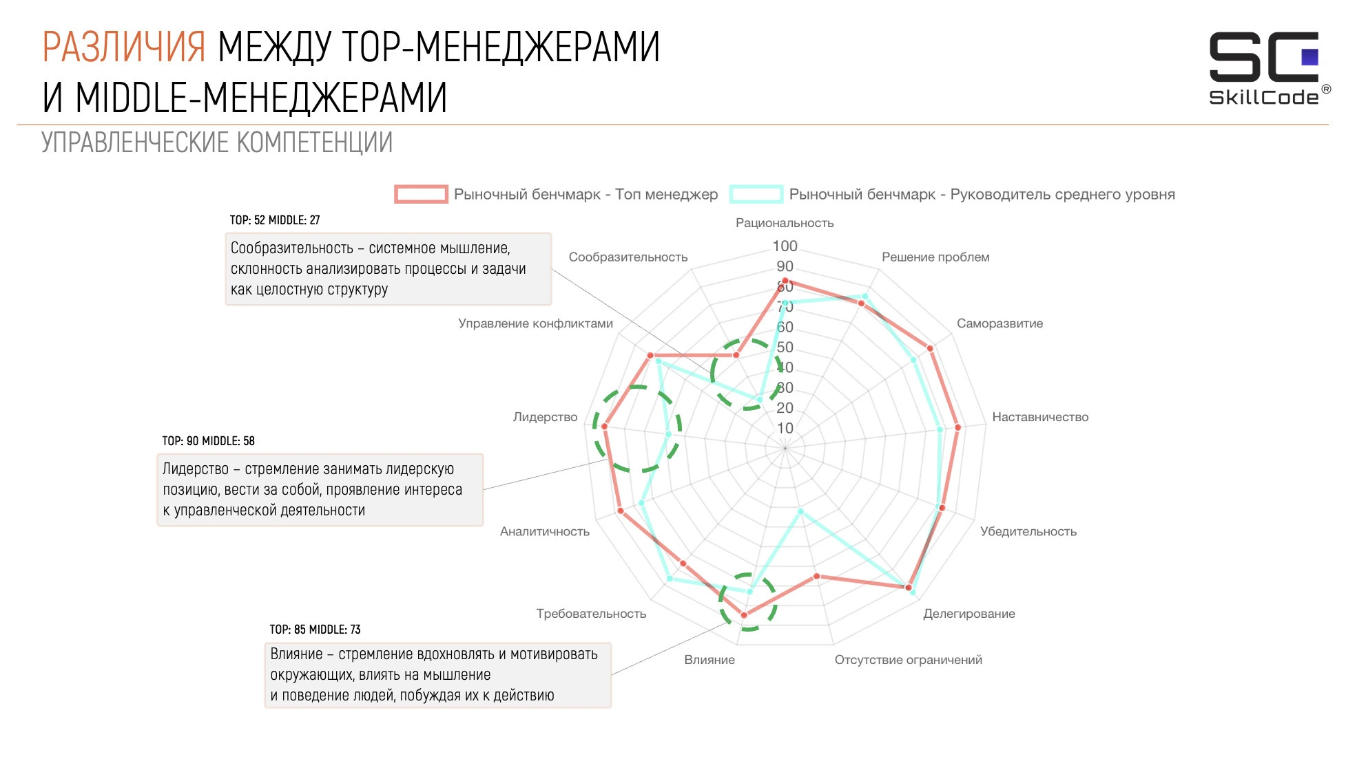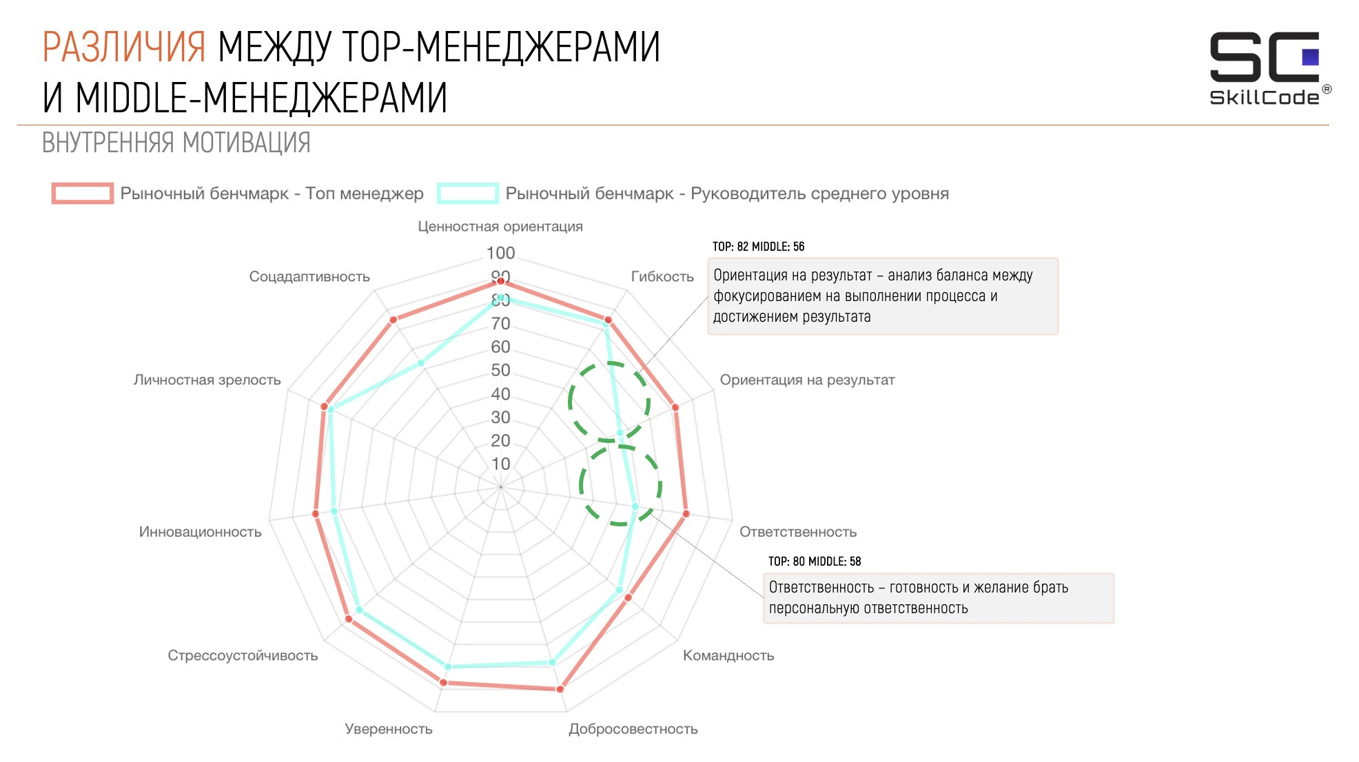 Исследование SkillCode подчёркивает: нет “идеального” уровня лидерства — есть соответствие компетенций роли. Топ-менеджмент и средний менеджмент делают разную работу, и лидерство у них проявляется по-разному.