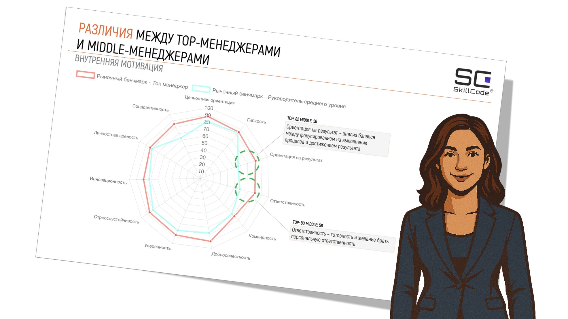 Если вы хотите принимать решения по руководителям на основе данных — в SkillCode можно провести оценку топ-менеджеров и руководителей. Это помогает увидеть сильные стороны, риски и зоны роста и использовать результаты в подборе, развитии, ротации и формировании кадрового резерва.