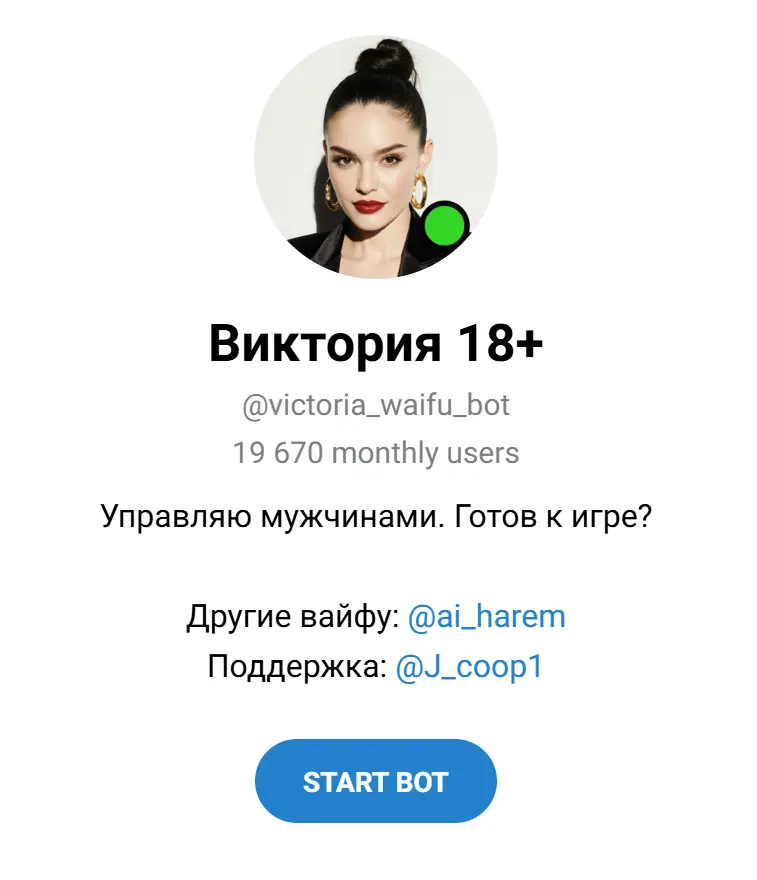 - Виктория 18+ Русскоязычная девушка бот для общения, которая чувствуется максимально живой и приземлённой. Преимущества: естественная речь, предсказуемые реакции, стабильные переписки с ИИ девушкой без странных «сбоев», секстинг и доверительные темы подаются через формат понятной интернет девушки, а не через «громкий» NSFW-образ.