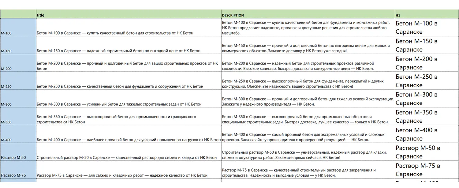 - Создали отдельные посадочные страницы под ключевые марки бетона. Для популярных марок (например, М-100, М-150, М-200 и т. д.) спроектировали и начали наполнять новые страницы с уникальными описаниями и параметрами. Такие посадочные помогают собирать спрос по низкочастотным, но "теплым" запросам, когда клиент уже знает, какую марку ищет.