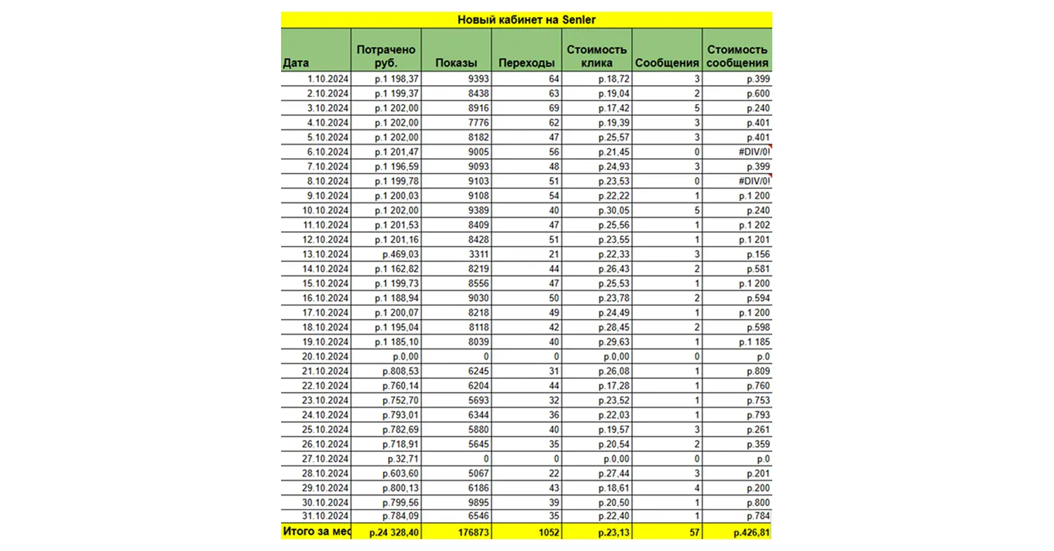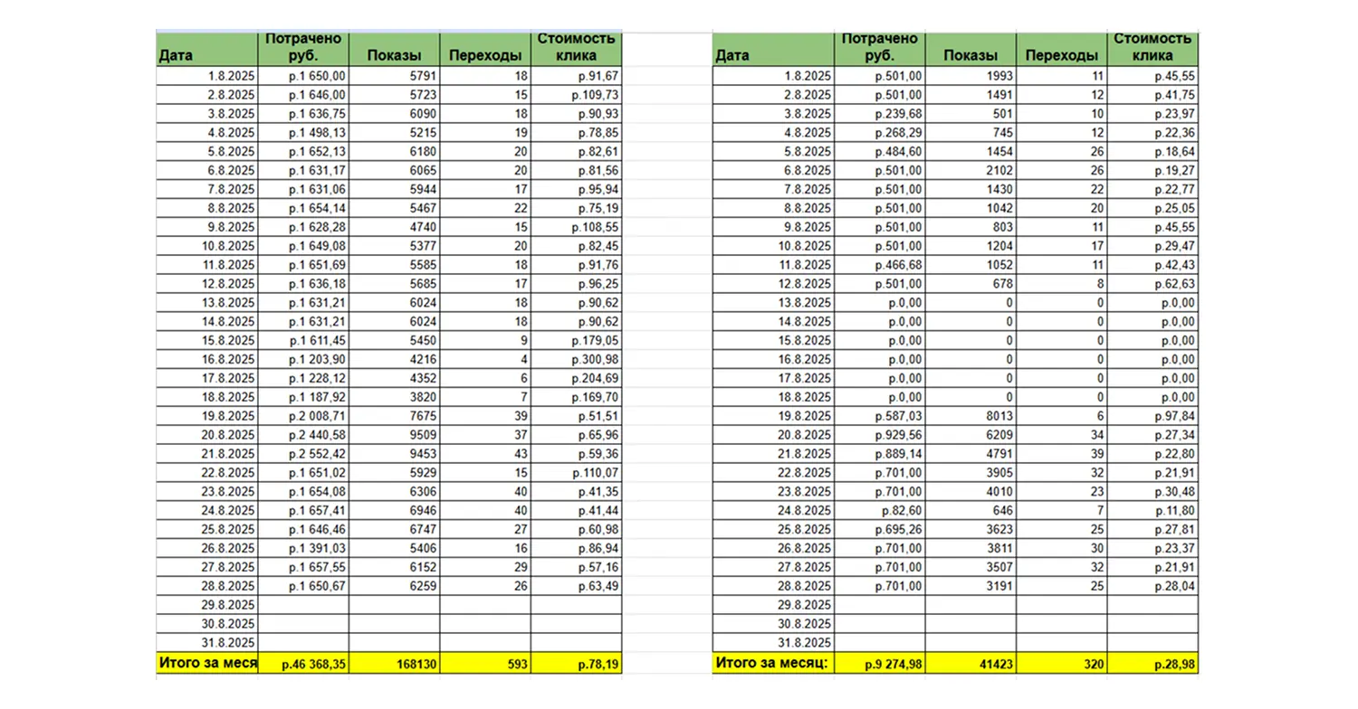 Мы вели проект через ежедневные отчёты по кабинетам и направлениям: отдельно фиксировали расходы, показы, переходы, стоимость клика и итоговые действия (обращения или подписки).