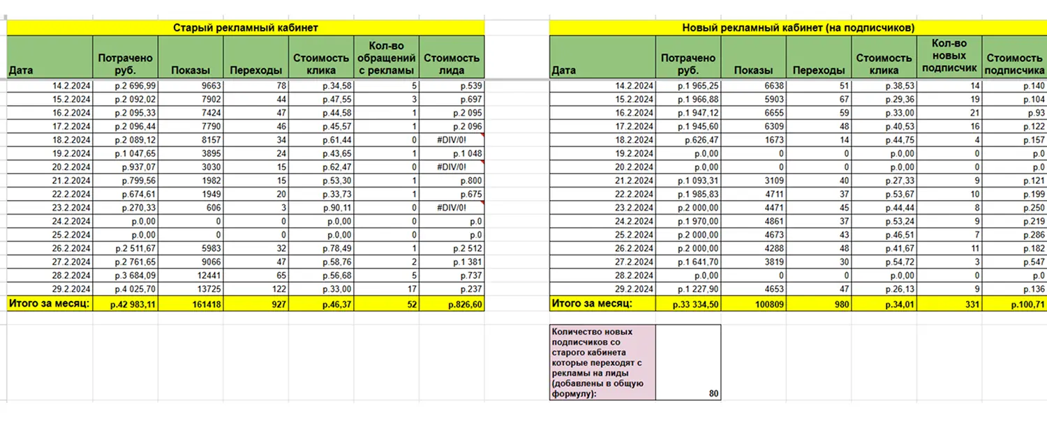 Главная сложность была в том, что реклама шла сразу в нескольких кабинетах и на разные цели. Мы разложили всё по полкам: отдельно подписки, отдельно лиды и отдельно сообщения, и начали управлять цифрами ежедневно, а не раз в месяц.