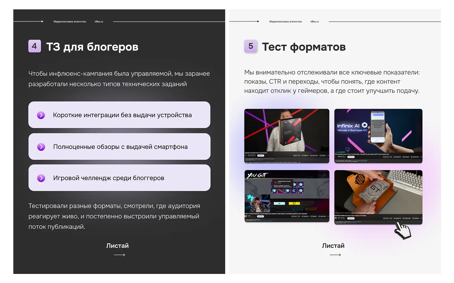«Наша задача была не просто составить ТЗ для блогеров. Мы хотели, чтобы они могли рассказать о смартфоне своим голосом, показывая, как смартфон реально работает в играх. Тестировали разные форматы, смотрели, где аудитория реагирует живо, и постепенно выстроили управляемый поток публикаций, где каждый клик и просмотр имеют значение»