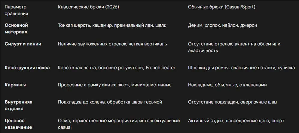 Обычные брюки — такие как джинсы, карго или спортивные джоггеры — шьются с приоритетом на утилитарную износостойкость или максимальную эластичность в неформальной среде. Классические же брюки ориентированы на создание архитектурного силуэта, который корректирует пропорции мужской фигуры, придавая ей стройность, вертикальность и формальную завершенность.