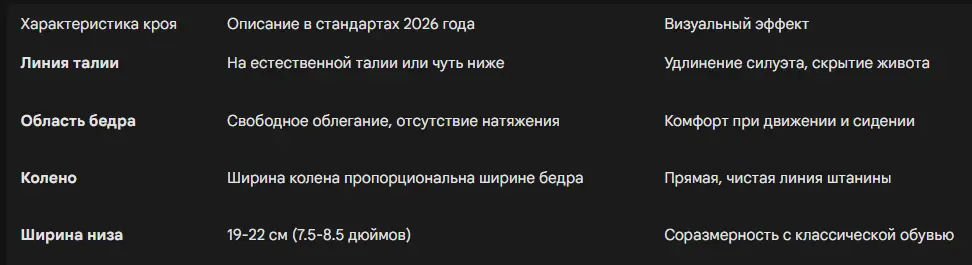 Классический крой обеспечивает достаточный припуск на свободу облегания в области седалища и бедер. Это предотвращает натяжение ткани и появление горизонтальных складок в области паха. Особое внимание уделяется глубине посадки: брюки не должны «врезаться», но и не должны висеть слишком низко, создавая неопрятный вид.