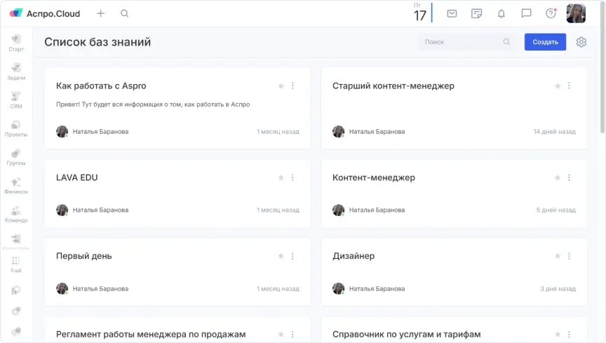 Вместо фрагментированной системы хранения документов команда перешла к централизованной базе знаний. Ранее ключевые материалы — регламенты, контракты, инструкции — рассредотачивались по различным платформам, из-за чего их поиск занимал значительное время. Теперь вся информация собрана в едином пространстве Аспро.Cloud: