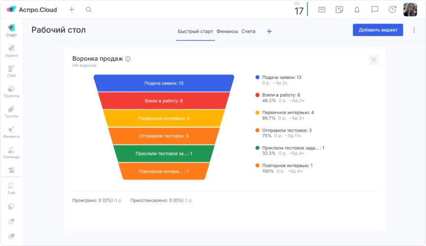 Помимо управления проектами и воронки HR, агентство внедрило учёт финансов и модуль онбординга.