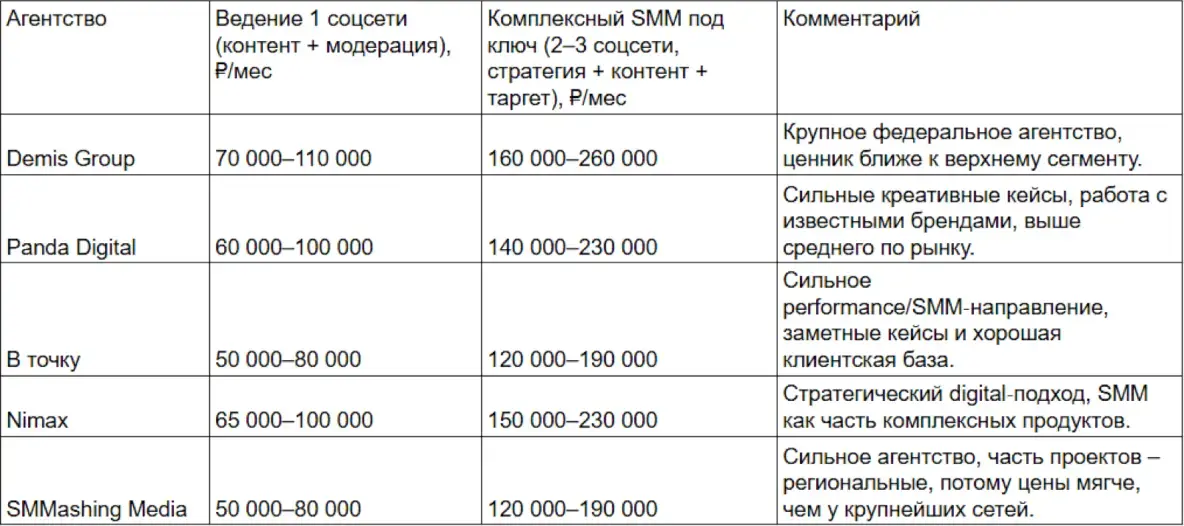 Инфлюенс-маркетинг | 40 000–200 000 ₽/мес или 10–20% от бюджетаSMM под ключ | 200 000–800 000 ₽/мес