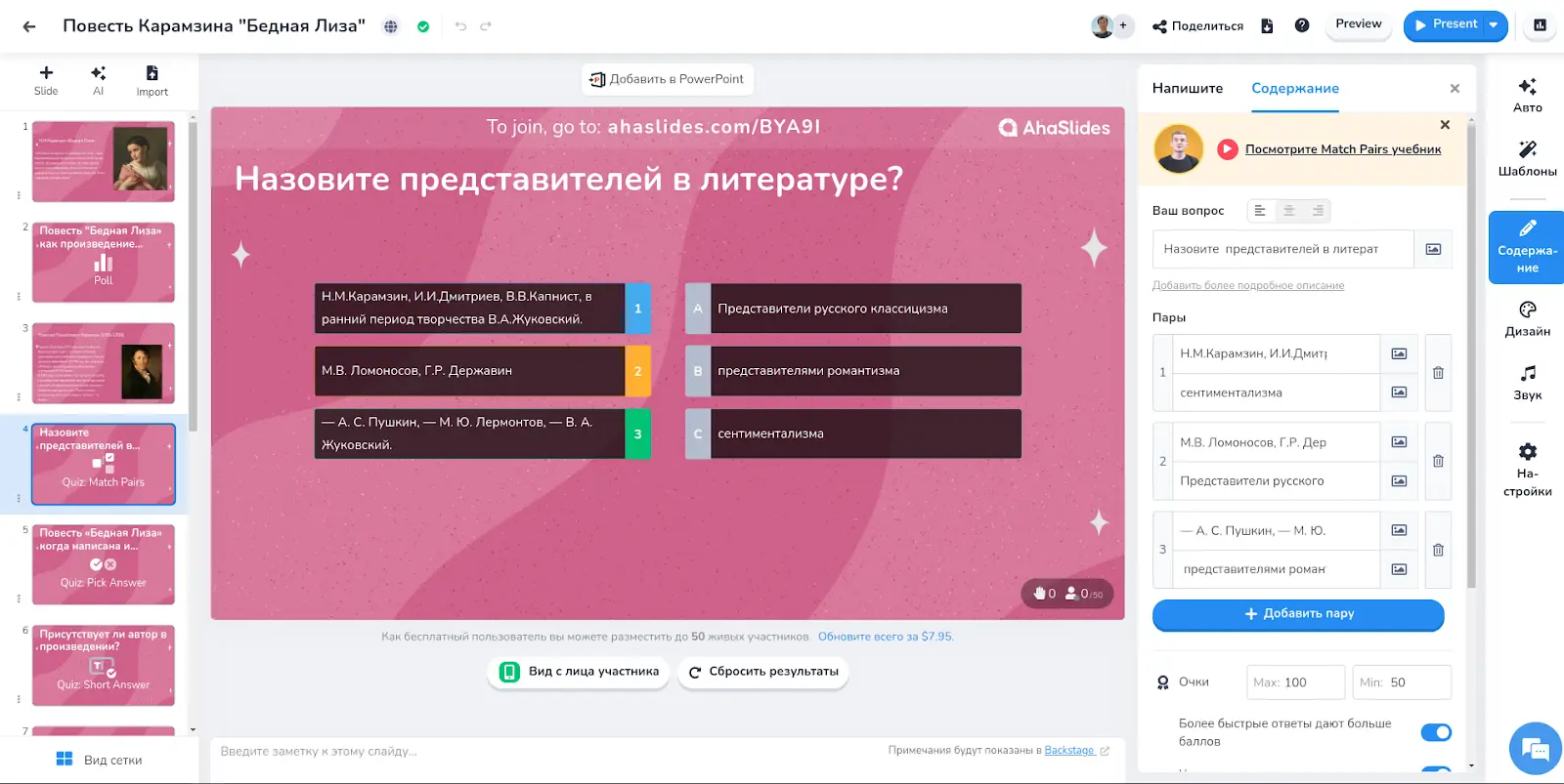 После ухода первого инструмента, пришлось искать замену, которая доступна из России. В качестве достойной альтернативы я выбрал Ahaslides. Мне очень понравилась возможность добавлять информационные слайды к вопросам и довольно широкий бесплатный функционал. Пожалуй это одно из лучших решений в данном сегменте. К сожалению так длилось до недавнего времени и осенью 2024 года вышло обновление, которое сделало платным почти все функции для аудитории больше 3 человек. У меня не было иностранной банковской карты для оплаты, цена показалась достаточно высокой, а на фоне новой лавины ухода иностранных компаний с нашего рынка, я решил искать отечественные ресурсы.