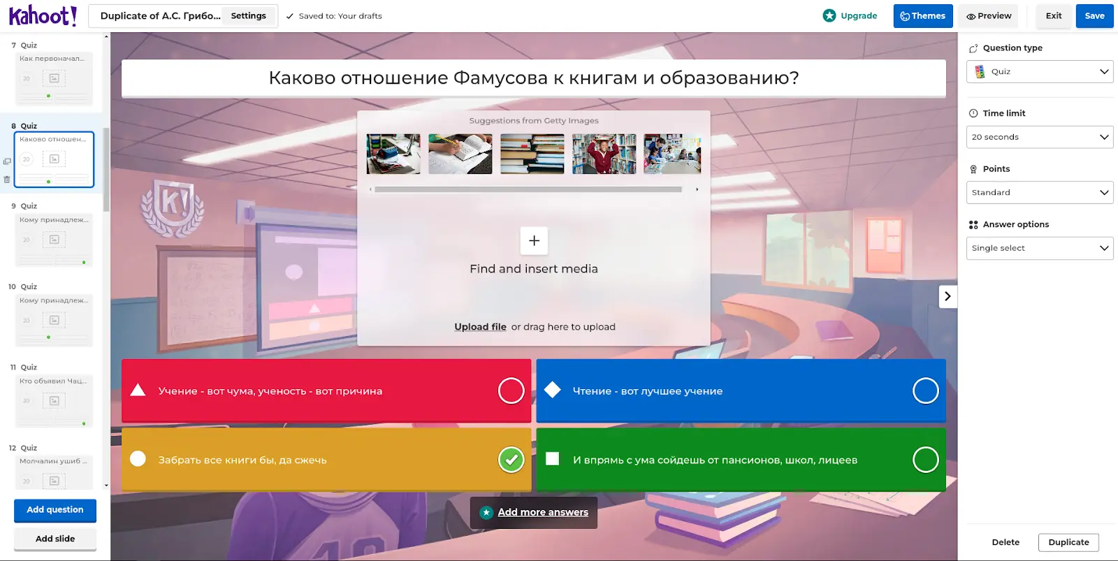 Применяя образовательные квизы таким образом, я решаю следующие проблемы: собираю посещаемость занятия (система отслеживает тех, кто подключился), мотивирую запоминать материал. Помимо этого, студенты больше не просят подержать слайд подольше или подсказать, что написано «мелким» шрифтом. Вся информация дублируется на их устройства, поэтому они видят всю информацию.