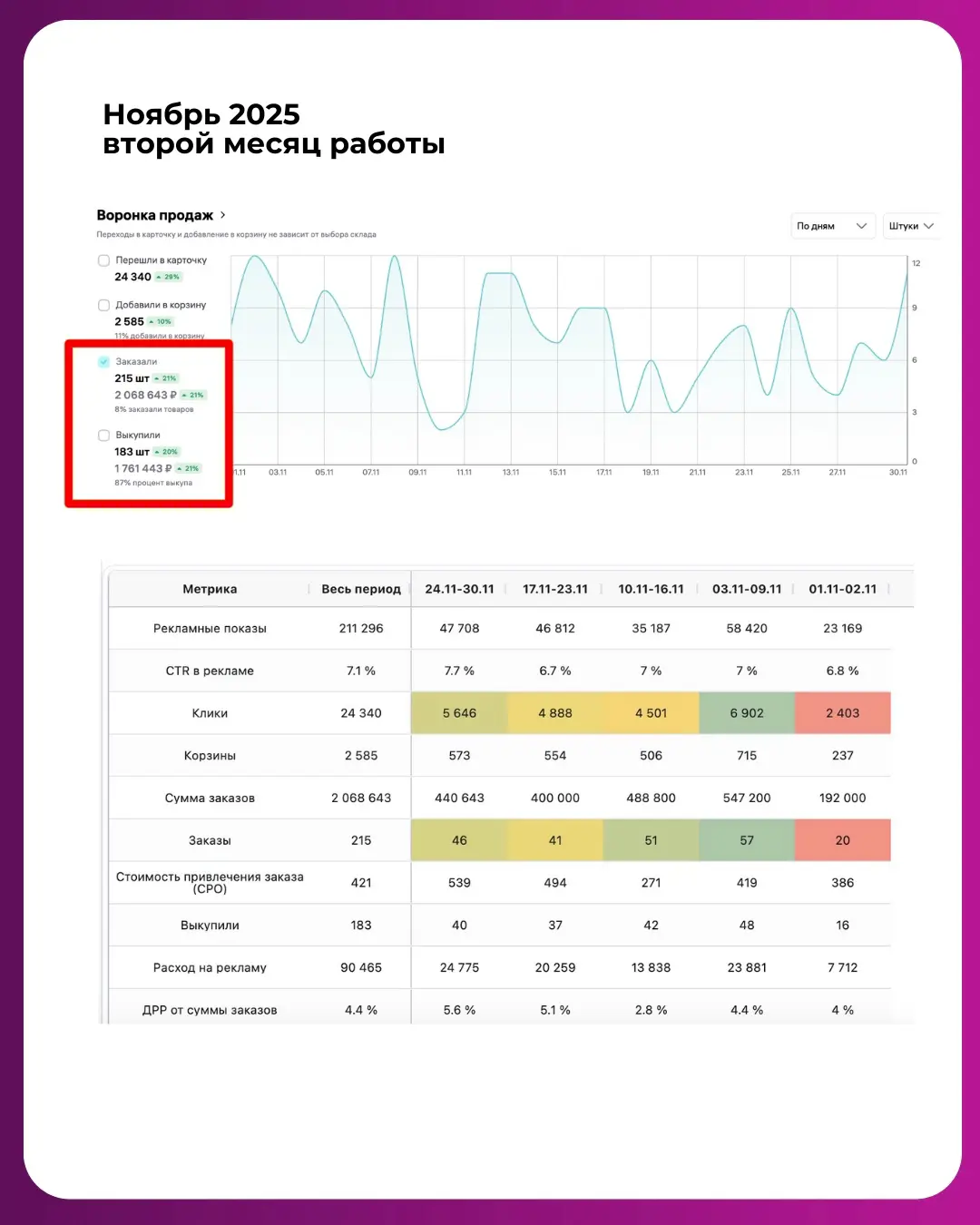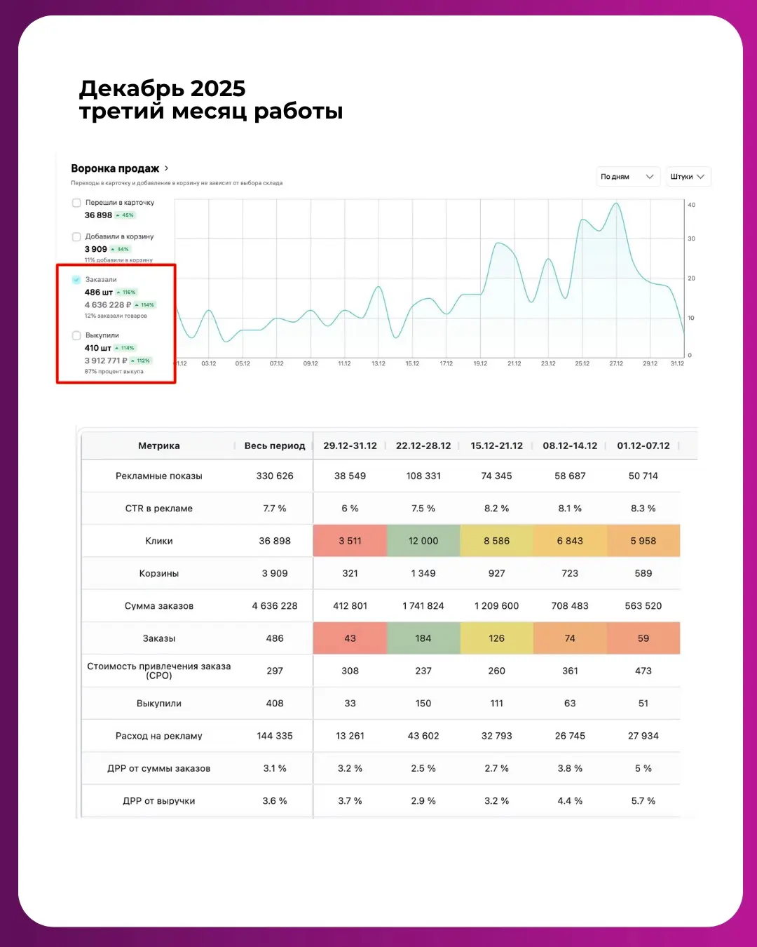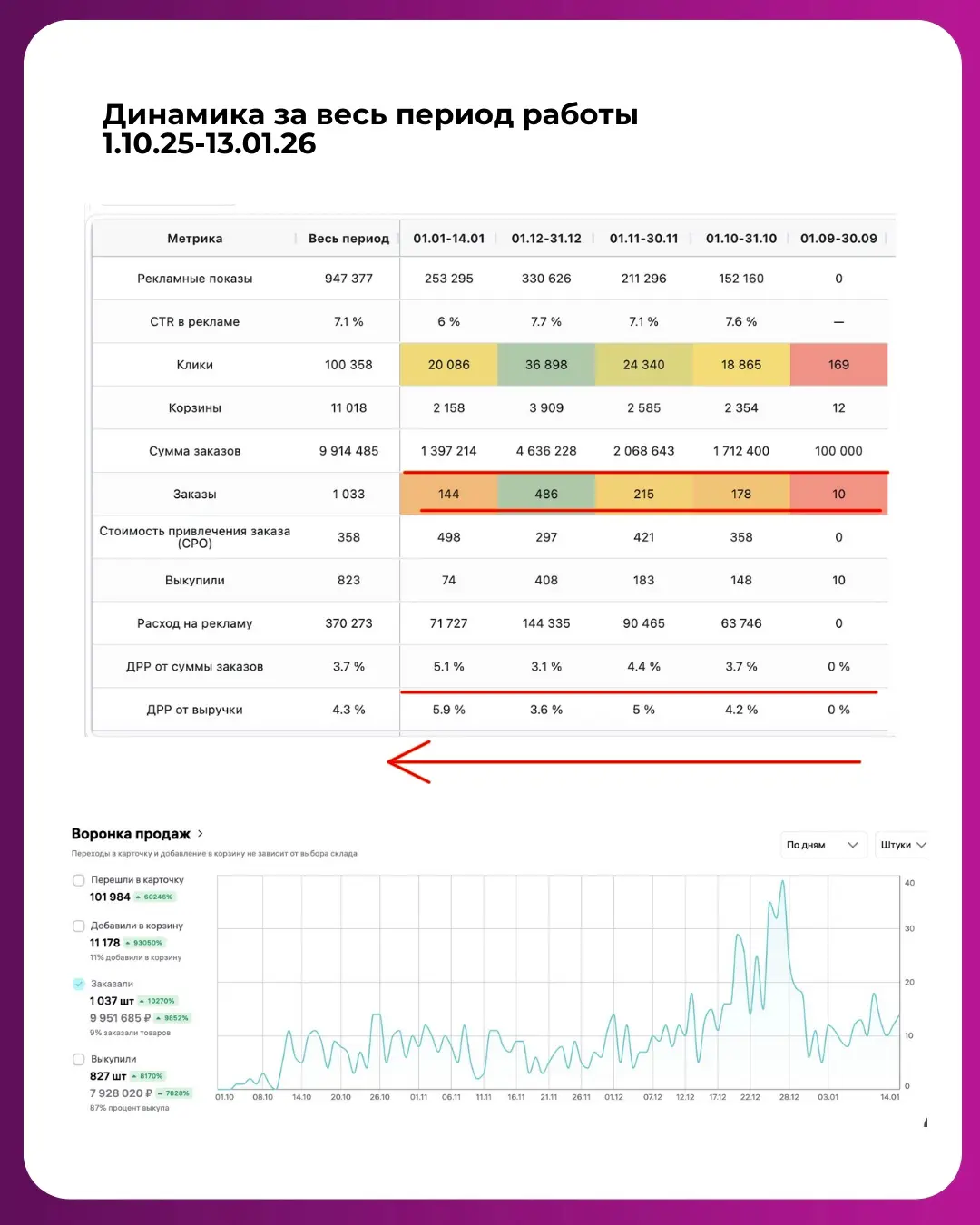 Таким образом за 3 месяца нам удалось выйти на объем заказов более 4 млн рублей в месяц с ДРР в рамках установленных селлером пределах.