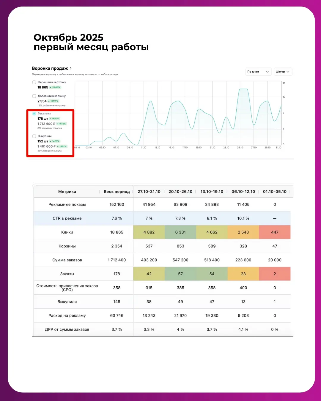 Селлер же вывел товар в сентябре. Сделал 10 самовыкупов для отзывов, но рекламу не запускал. Задачи, которые ставились перед нами: