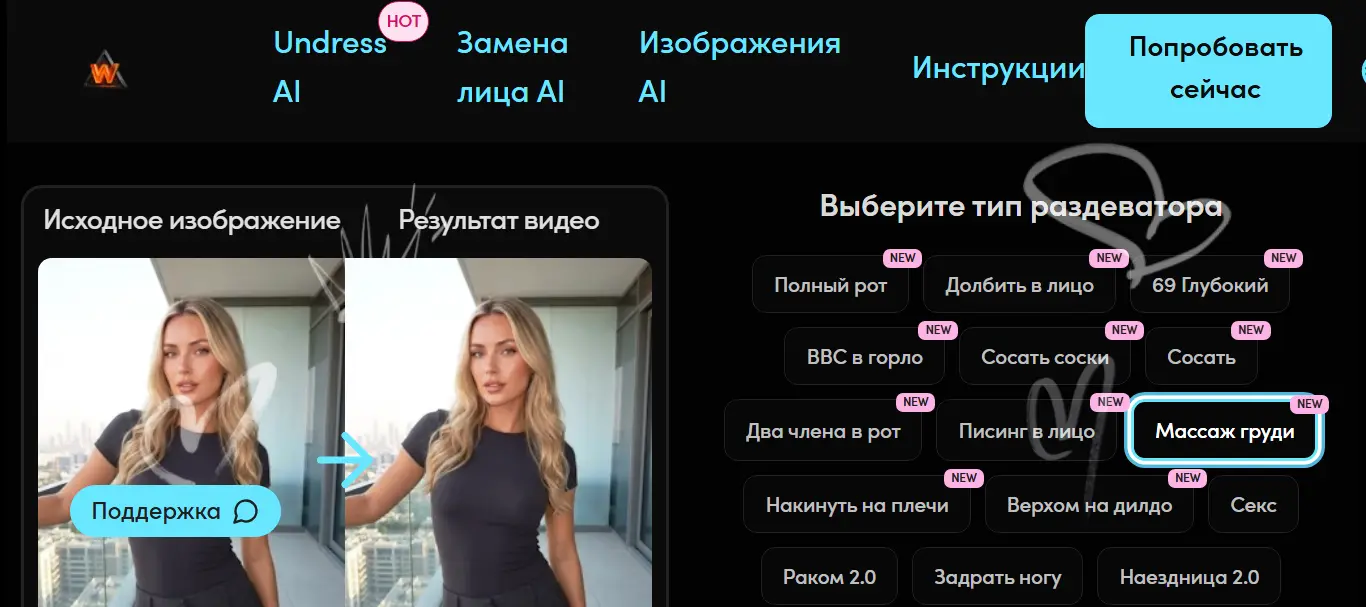 Один из самых популярных сервисов для раздевания и генерации nude на основе фото. Очень точная работа с одеждой, хорошая детализация тела. Есть режим оффлайн для локальных моделей. Поддерживает высокое разрешение и разные стили. Бесплатный доступ ограничен, но премиум оправдан качеством. Идеален для тех, кто хочет работать с существующими фотографиями и получать максимально натуральный результат в генераторе nsfw видео и фото.