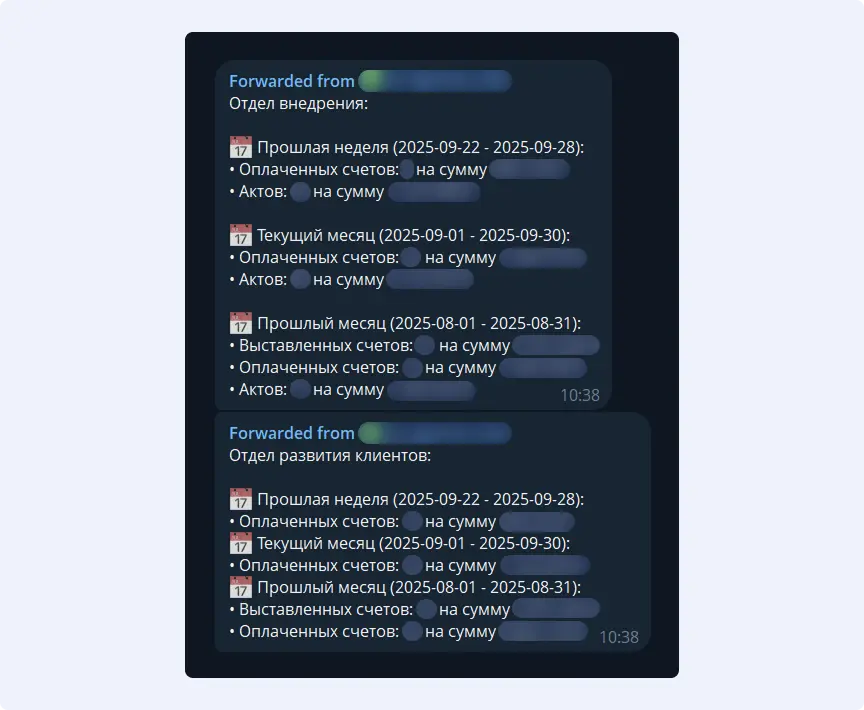 Параллельно мы настроили отчеты по выставленным счетам. Они автоматически отправляются в Telegram исполнительному директору и руководителям подразделений.