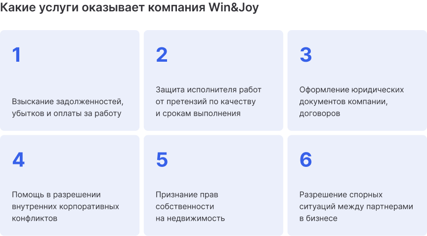 Win&Joy защищает интересы бизнеса с 2015 года. Компания специализируется на арбитражных спорах, корпоративных разбирательствах и судебном представительстве. За 10 лет юристы реализовали более 100 проектов.