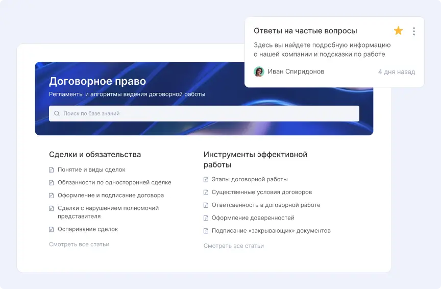Компания начала формировать внутреннюю библиотеку. В которую входят кейсы, судебная практика, шаблоны договоров и регламенты. Это упрощает адаптацию новых сотрудников и снижает количество внутренних вопросов.