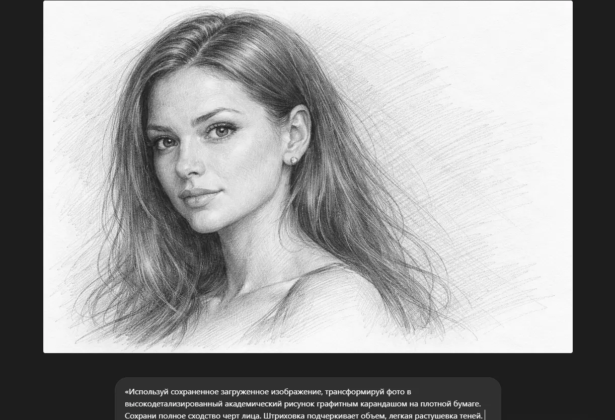 «Используй сохраненное загруженное изображение, трансформируй фото в высокодетализированный академический рисунок графитным карандашом на плотной бумаге. Сохрани полное сходство черт лица. Штриховка подчеркивает объем, легкая растушевка теней. Фон остается белым с легкими набросками линий. Манера классической художественной школы. Монохром (оттенки серого)».