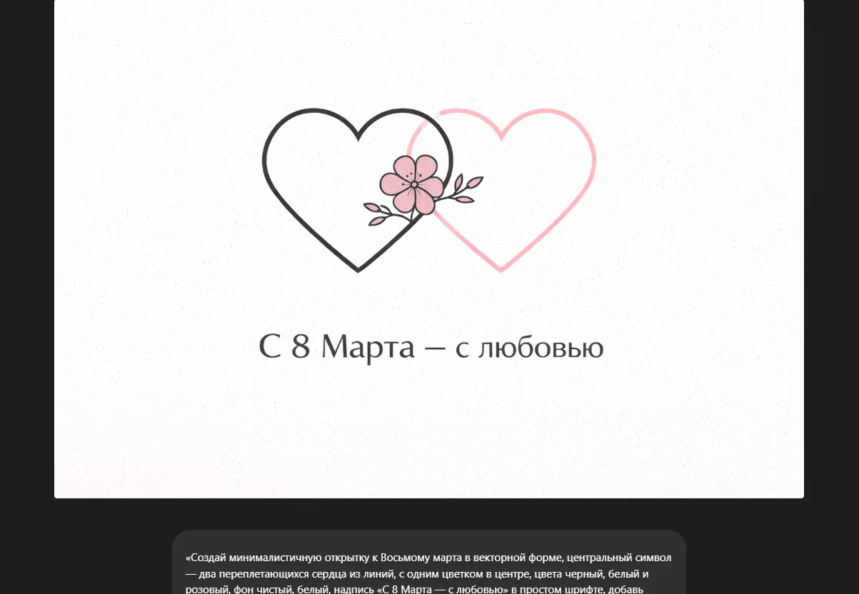 «Создай минималистичную открытку к Восьмому марта в векторной форме, центральный символ — два переплетающихся сердца из линий, с одним цветком в центре, цвета черный, белый и розовый, фон чистый, белый, надпись «С 8 Марта — с любовью» в простом шрифте, добавь тонкие линии для текстуры, высокое разрешение, стиль как у скандинавского дизайна».