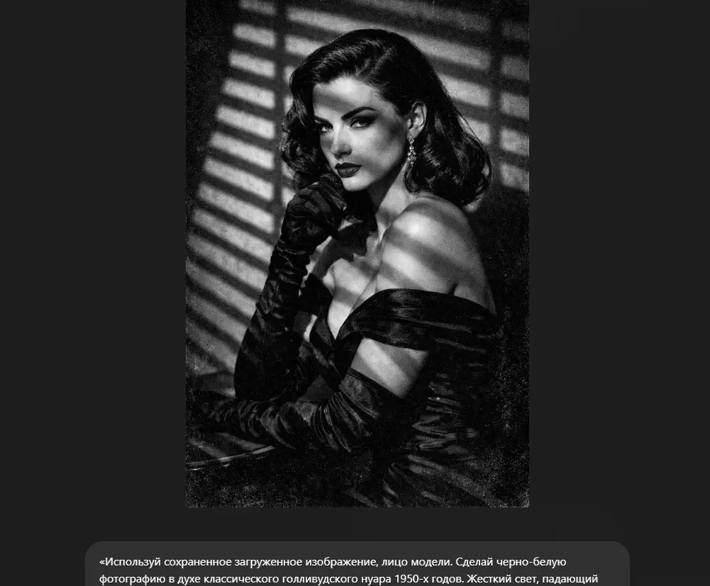 «Используй сохраненное загруженное изображение, лицо модели. Сделай черно-белую фотографию в духе классического голливудского нуара 1950-х годов. Жесткий свет, падающий через жалюзи (тени-полоски на фоне и одежде). Одежда: вечернее платье с открытыми плечами и длинные перчатки. Эмоция: роковая женщина. Добавь зернистость пленки Kodak Tri-X. Высокий контраст между светом и тенью».