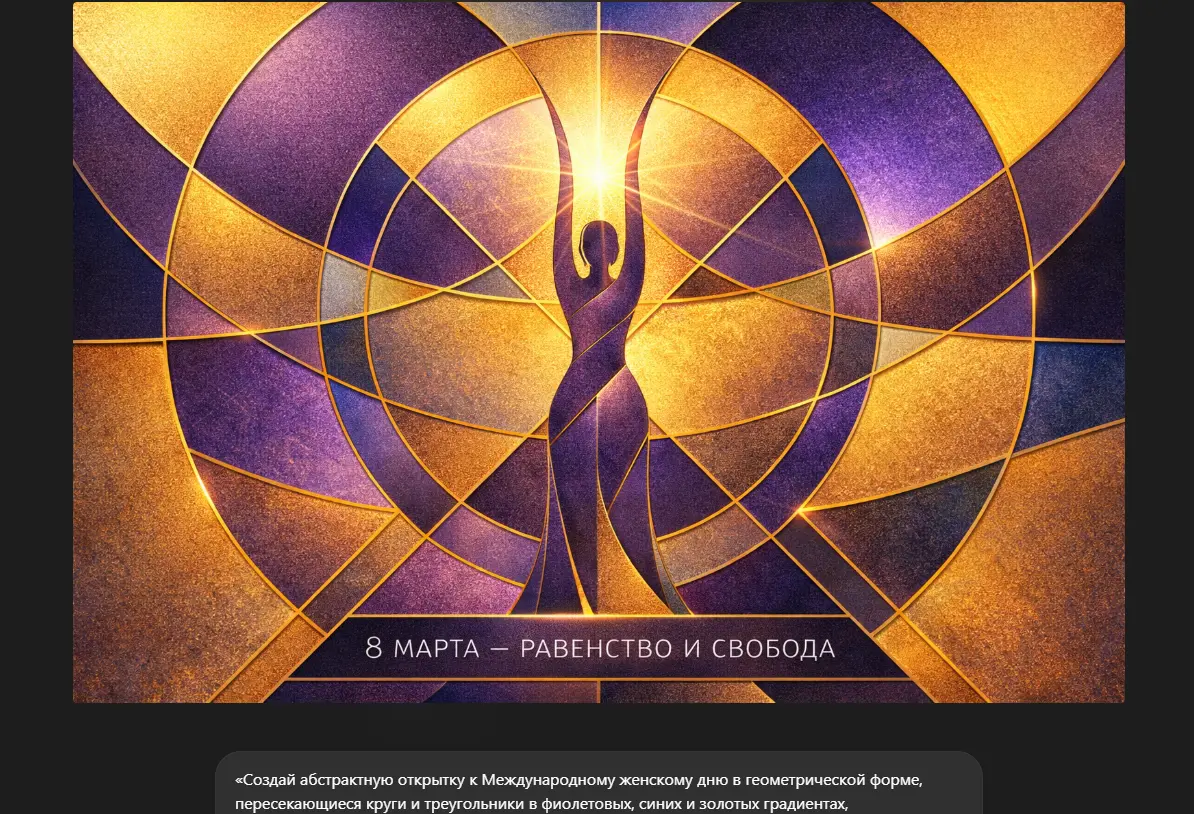 «Создай абстрактную открытку к Международному женскому дню в геометрической форме, пересекающиеся круги и треугольники в фиолетовых, синих и золотых градиентах, символизирующие женскую энергию, центральный элемент — стилизованный силуэт женщины с поднятыми руками, надпись «8 Марта — равенство и свобода» в минималистичном шрифте, добавь текстуры металла и света для глубины, высокое разрешение, манера как у Мондриана с феминистским уклоном».
