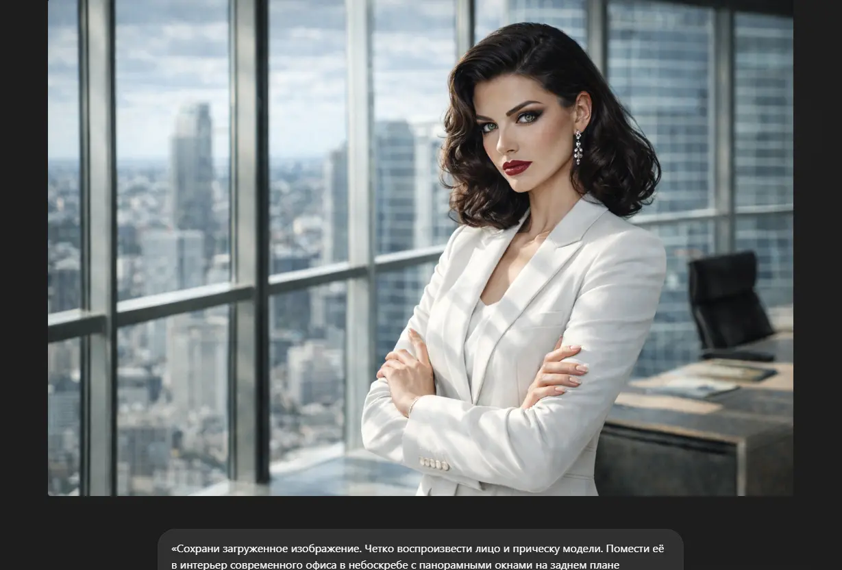 «Сохрани загруженное изображение. Четко воспроизвести лицо и прическу модели. Помести её в интерьер современного офиса в небоскребе с панорамными окнами на заднем плане (размытый фон города). Одежда: элегантный белый брючный костюм премиум-класса. Поза уверенная, руки скрещены на груди. Свет естественный, дневной, жесткий, подчеркивающий статус. Стилистика обложки делового журнала».