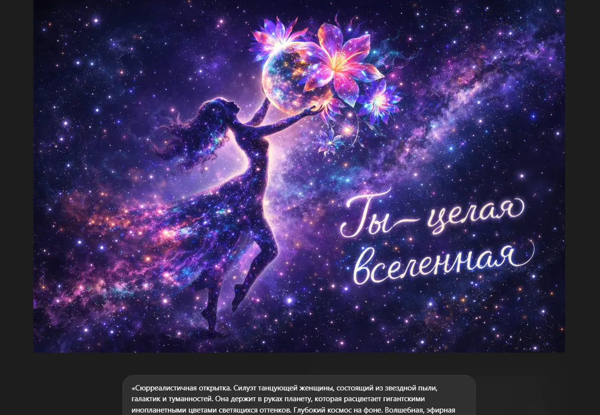 «Сюрреалистичная открытка. Силуэт танцующей женщины, состоящий из звездной пыли, галактик и туманностей. Она держит в руках планету, которая расцветает гигантскими инопланетными цветами светящихся оттенков. Глубокий космос на фоне. Волшебная, эфирная атмосфера. Текст «Ты — целая вселенная» написан светом. Высокая детализация, 8k».