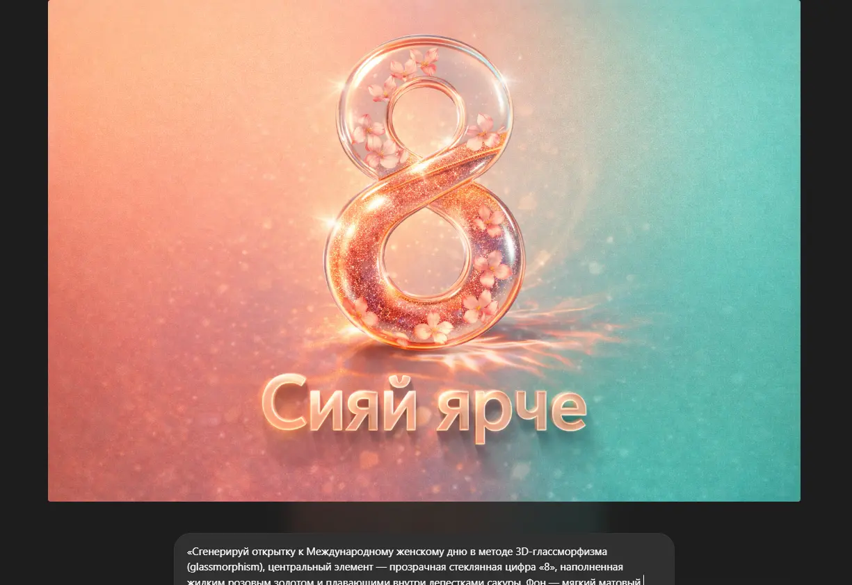 «Сгенерируй открытку к Международному женскому дню в методе 3D-глассморфизма (glassmorphism), центральный элемент — прозрачная стеклянная цифра «8», наполненная жидким розовым золотом и плавающими внутри лепестками сакуры. Фон — мягкий матовый градиент персикового и мятного цветов. Освещение студийное, создающее красивые блики и каустику на стекле. Надпись «Сияй ярче» объемными буквами. Разрешение 8K, как у современных 3D-дизайнеров интерфейсов».