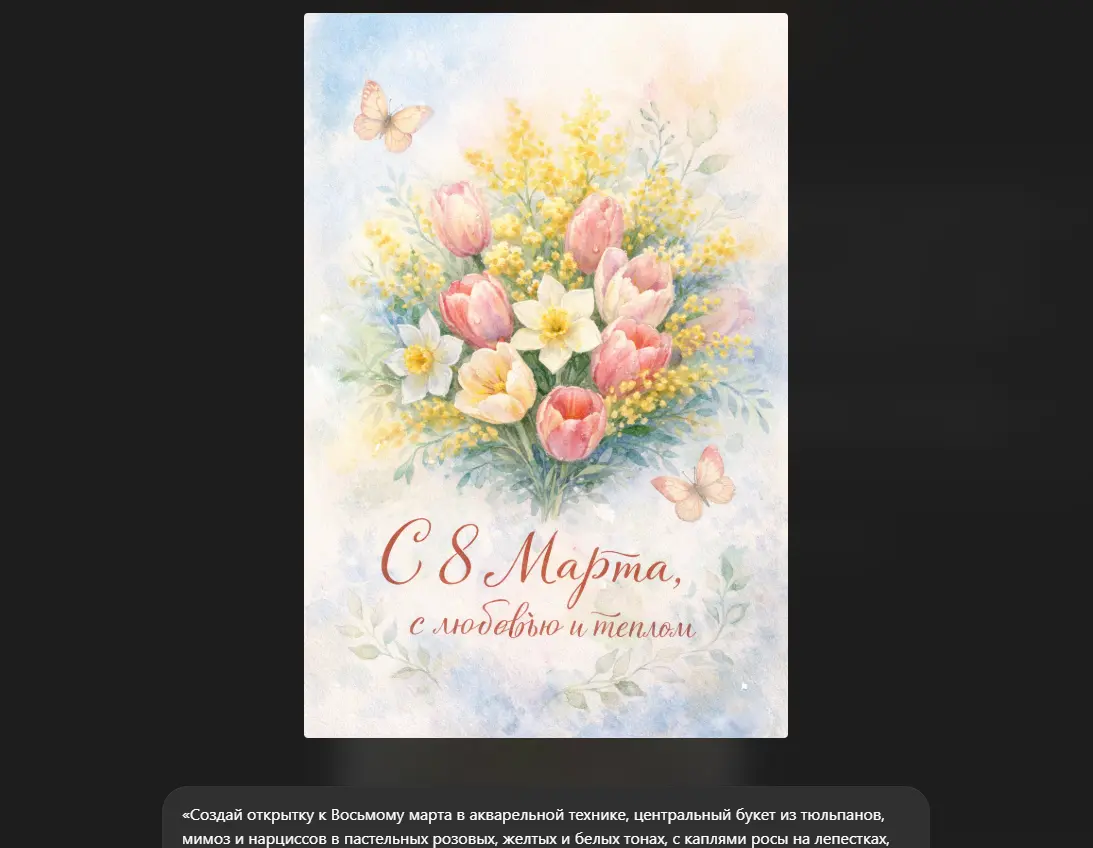В результате генерации вы получите карточку с мягким, романтичным сюжетом, где центральный элемент — букет цветов, написанный в акварельной технике.