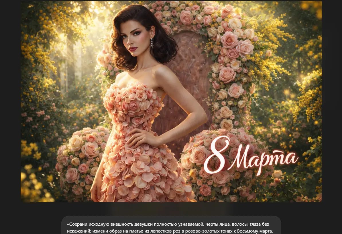 Для сохранения узнаваемости используйте режим Image-to-Image (генерация на основе фото) и ставьте высокий приоритет референсного изображения. Составляя промпты для ИИ-фотосессии 8 Марта, детально описывайте цвет глаз, волос и особенности внешности, чтобы помочь алгоритму.