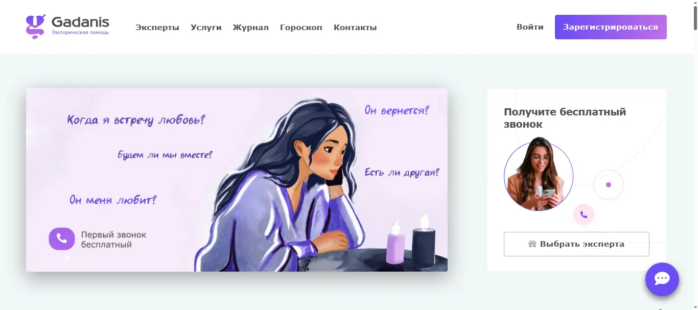 Gadanis - Получите бесплатный звонок! Переходите, чтобы выбрать лучшего эксперта! Запросите числовое резюме личности, соедините расчёт с Таро и за пару минут поймете, как узнать датированный прогноз событий и сможете купить подробный разбор при желании.