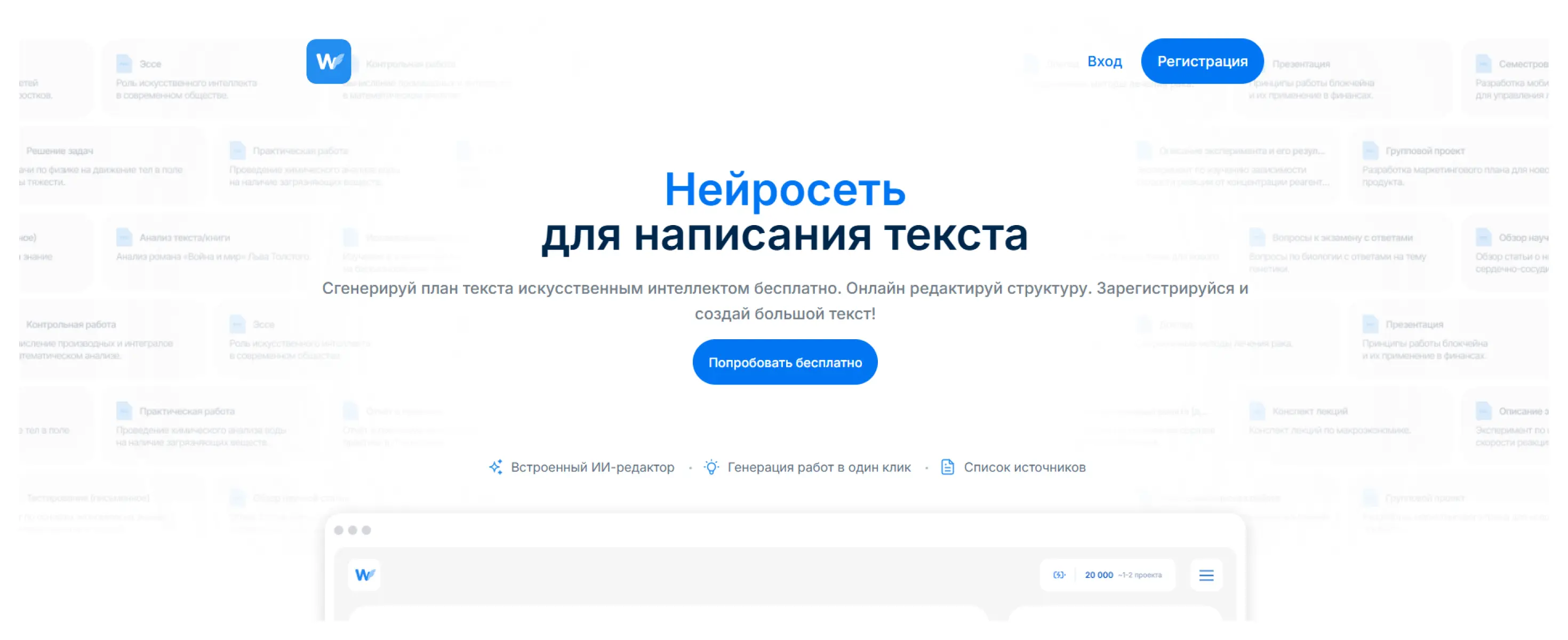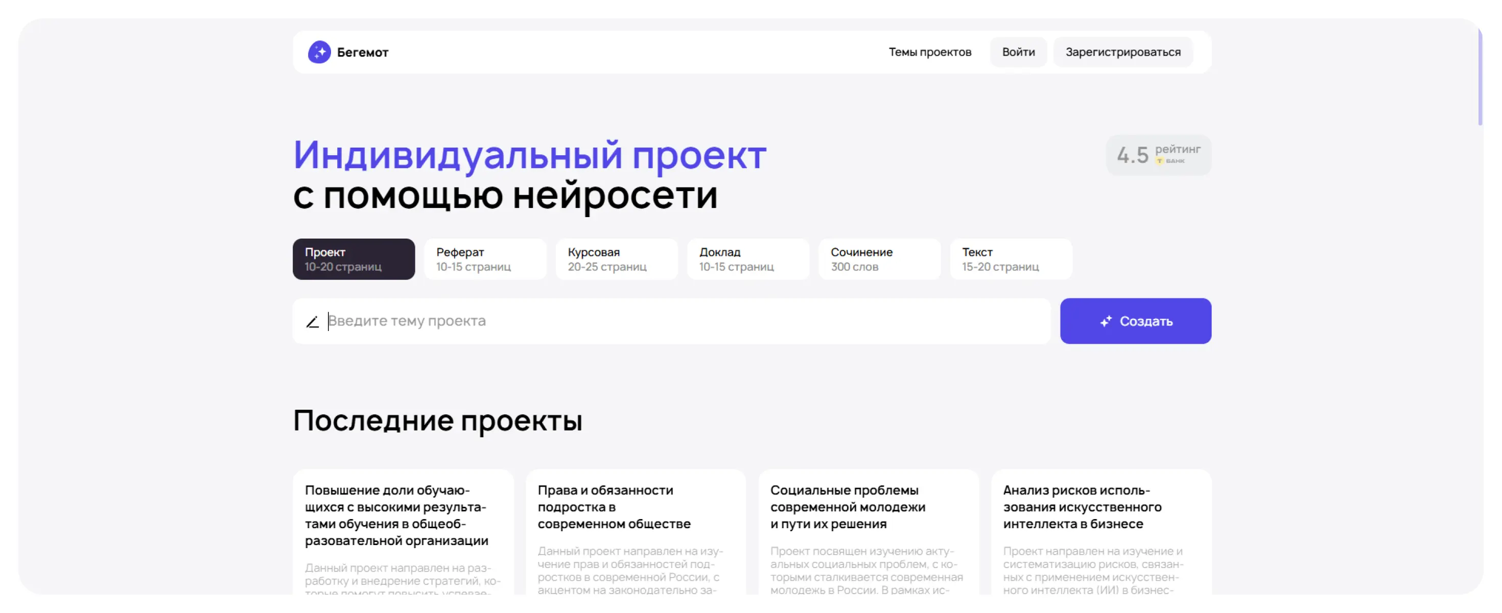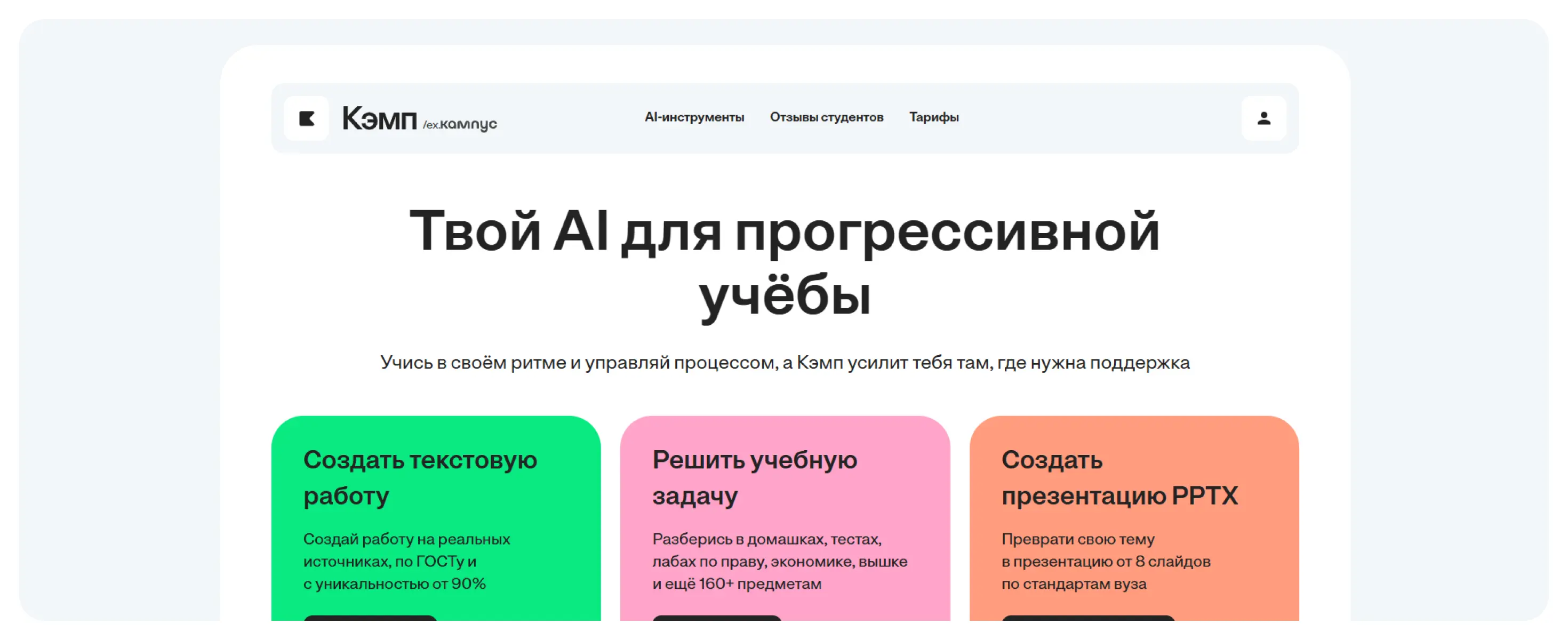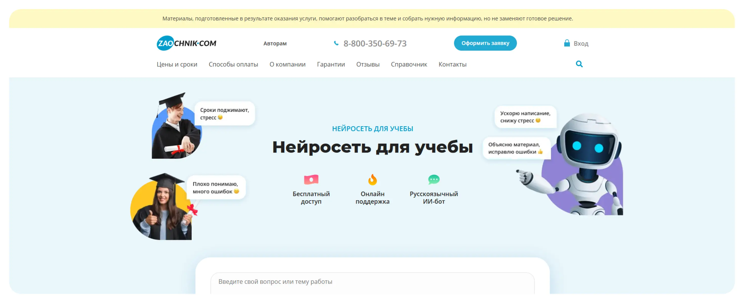 ИИ-помощник, созданный специально для студентов и школьников с учетом требований российской системы образования. Платформа предлагает комплексную помощь в учебе: генерацию текстов (отчетов, рефератов, курсовых), решение задач по 160+ предметам, анализ документов и функцию ИИ-чата, доступного в том числе через Telegram.